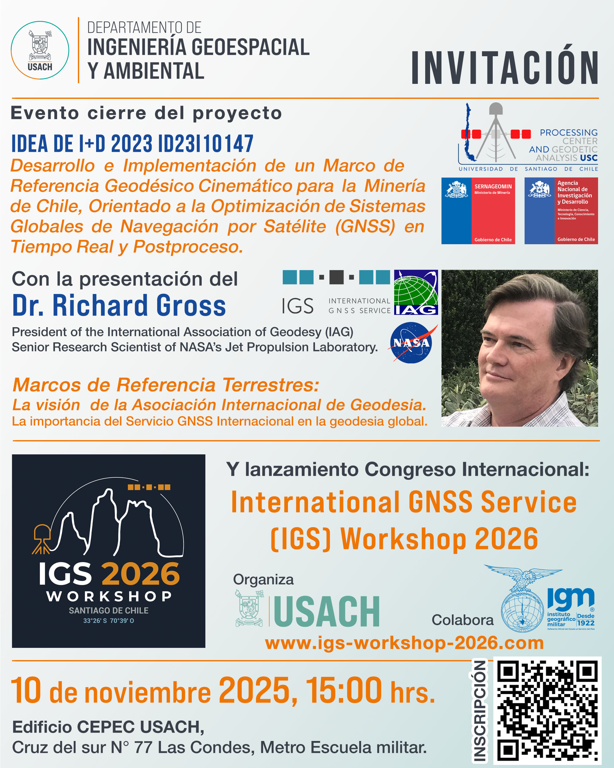 Invitación a evento cierre de proyecto "IDeA de I+D 2023 ID23I10147" y lanzamiento oficial Congreso "International GNSS Service (IGS) Workshop 2026"